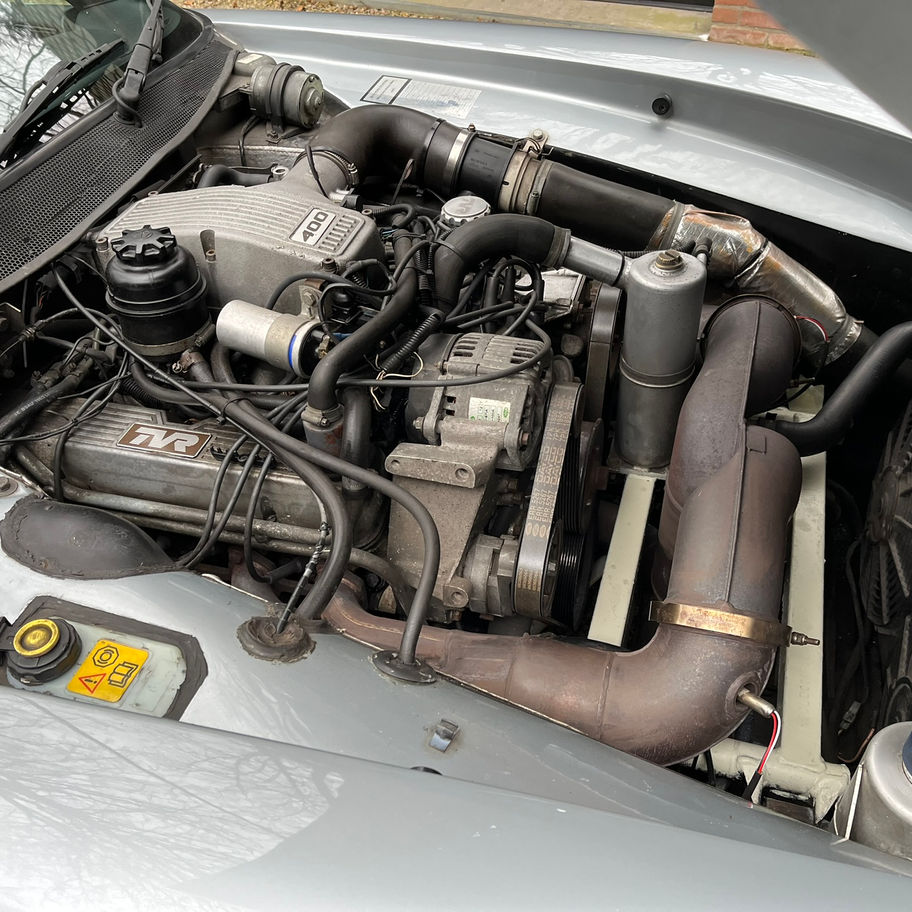 TVR in zilvergrijs metallic, interieur zwart leer.